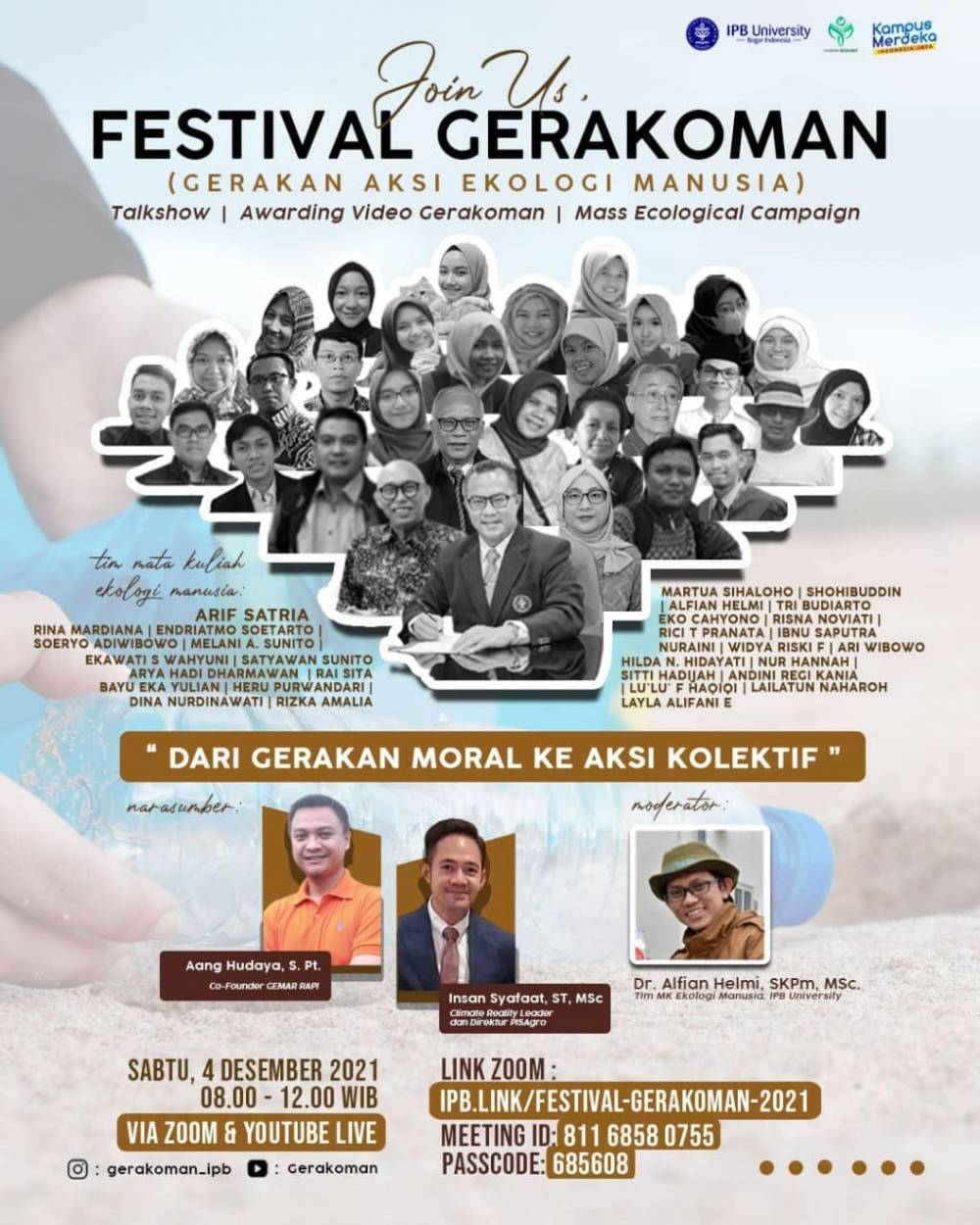 Hari Sabtu (4/12/2021) Festival Gerakoman (Gerakan Aksi Ekologi Manusia) 2021 kembali digelar sebagai penutup dari mata kuliah Ekologi Manusia Departemen Sains Komunikasi dan Pengembangan Masyarakat IPB University. Penyelenggaraan festival ini bertujuan sebagai aksi kolektif dalam penyelamatan lingkungan. Dr Rina Mardiana selaku koordinator mata kuliah tersebut menjelaskan bahwa “Aksi ini merupakan kontribusi besar civitas akademika IPB University dalam menyelamatkan bumi secara kolektif”.