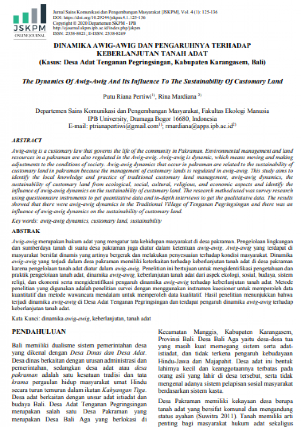 | Abstrak | : | Awig-awig is a customary law that governs the life of the community in Pakraman. Environmental management and land resources in a pakraman are also regulated in the Awig-awig. Awig-awig is dynamic, which means moving and making adjustments to the conditions of society. Awig-awig dynamics that occur in pakraman are related to the sustainability of customary land in pakraman because the management of customary lands is regulated in awig-awig. This study aims to identify the local knowledge and practice of traditional customary land management, awig-awig dynamics, the sustainability of customary land from ecological, social, cultural, religious, and economic aspects and identify the influence of awig-awig dynamics on the sustainability of customary land. The research method used was survey research using questionnaire instruments to get quantitative data and in-depth interviews to get the qualitataive data. The results showed that there were awig-awig dynamics in the Traditional Village of Tenganan Pegringsingan and there was an influence of awig-awig dynamics on the sustainability of customary land. |