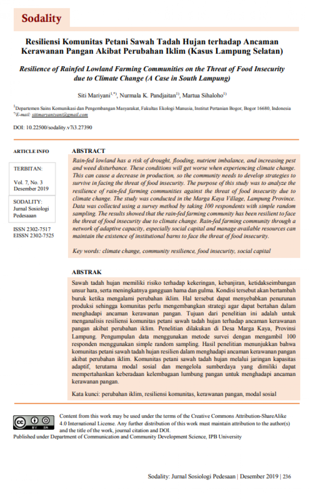 | Judul | : | Resilience of Rainfed Lowland Farming Communities on the Threat of Food Insecurity due to Climate Change (A Case in South Lampung) |